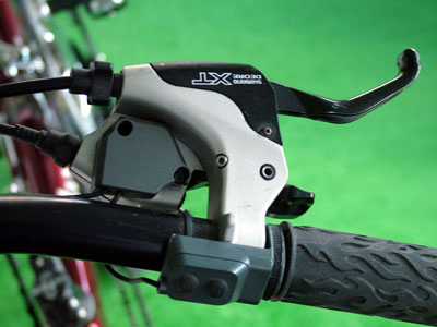 Shimano XT brake lever and integrated trigger shifters. The FlightDeck computer pickups mount to the shift pods. The buttons by your right thumb operate the computer remotely.